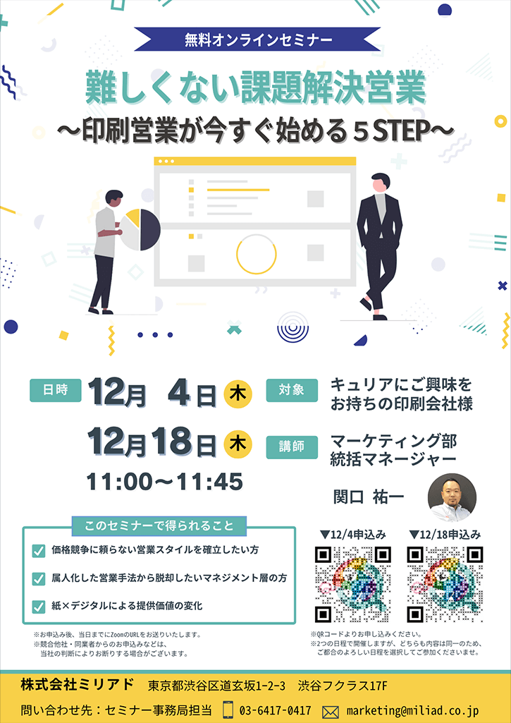 2025/12/4(木) ・18(木)にオンラインセミナー「難しくない課題解決営業 〜印刷営業が今すぐ始める5STEP〜」を開催いたします。難しくない課題解決営業 〜印刷営業が今すぐ始める5STEP〜