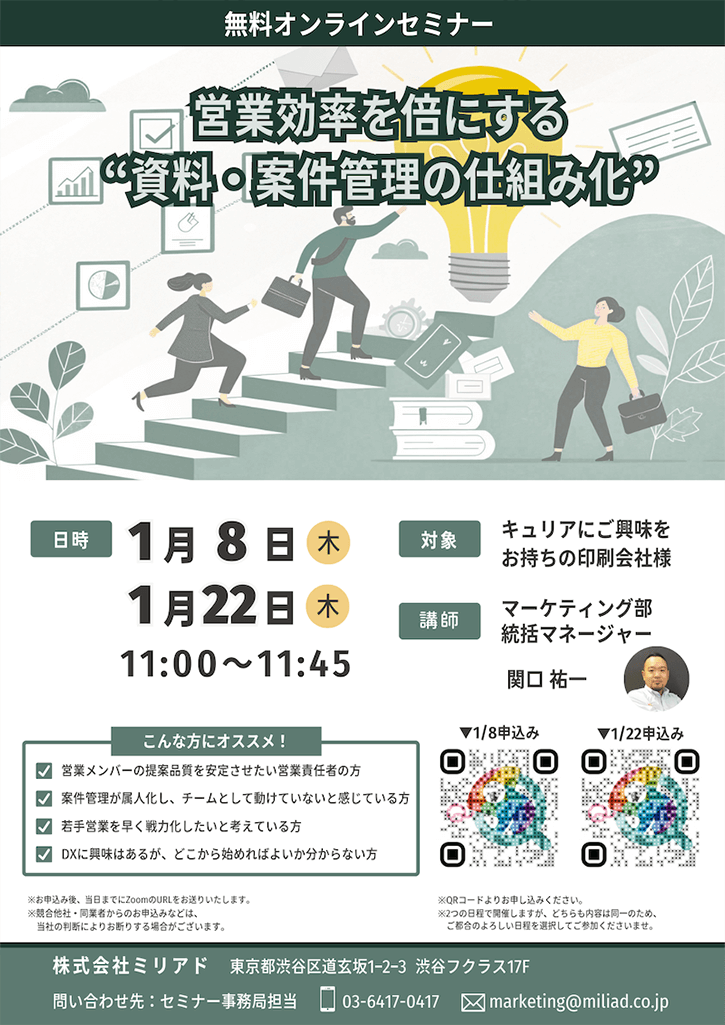 2026/1/8(木) ・22(木)にオンラインセミナー「営業効率を倍にする”資料・案件管理の仕組み化”セミナー」を開催いたします。営業効率を倍にする”資料・案件管理の仕組み化”セミナー